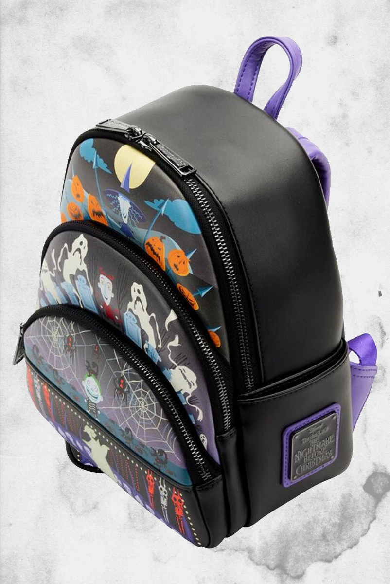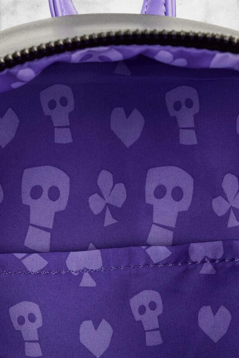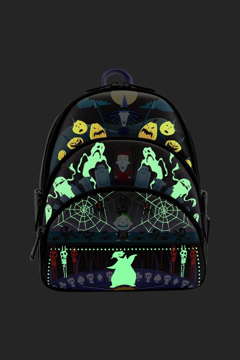 The Loungefly Nightmare Before Christmas Glow Triple Pocket Lock, Shock, and Barrel Oogie Boogie Mini Backpack is made of vegan leather (polyurethane). Bag has adjustable shoulder straps and sturdy metal hardware. Additional features include embossed, printed, and glow-in-the-dark details. Take note of the coordinating inside lining.
