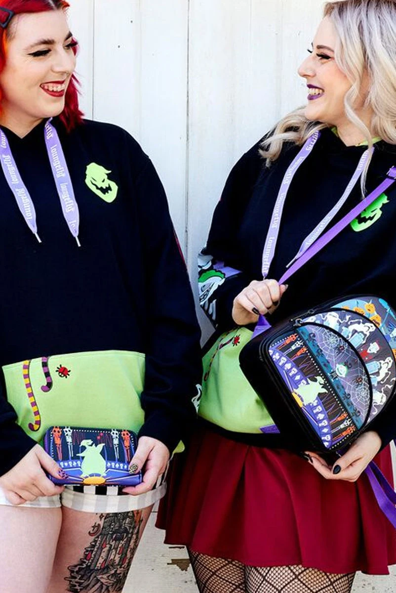 Oogie Boogie has sent his finest trick-or-treaters to carry out his dastardly plans. Stay on his good side, or he may send his mischievous henchmen after you! The Loungefly Nightmare Before Christmas Glow Triple Pocket Lock, Shock, and Barrel Oogie Boogie Mini Backpack features Oogie Boogie as he spins on a roulette wheel. Up above, Lock, Shock, and Barrel can be found lurking in some spooky hideaways of Halloween Town. Turn the bag around to find Oogie’s dice, waiting to decide your fate! This frightfully fun accessory glows in the dark and has plenty of room for storing your tricks and treats.