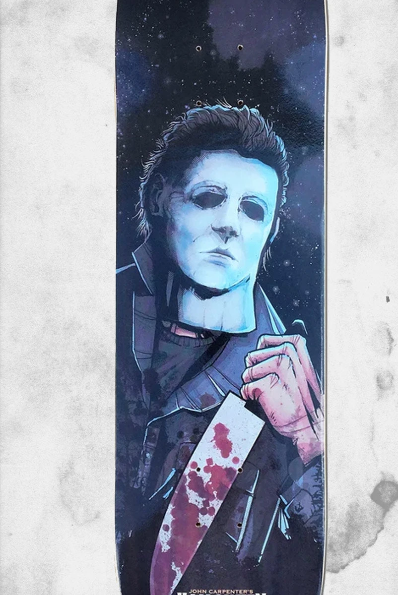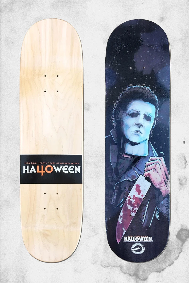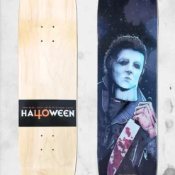 Looking for that perfect item to hang on your wall or give to the ultimate Michael Myers fan that has everything? Well stop looking and get this officially licensed Michael Myers Halloween skateboard deck! This movie poster deck is a must for any Halloween and Myers collector.
