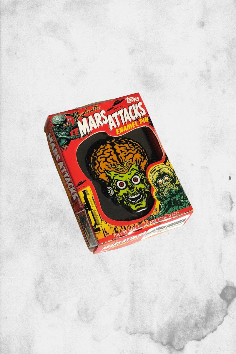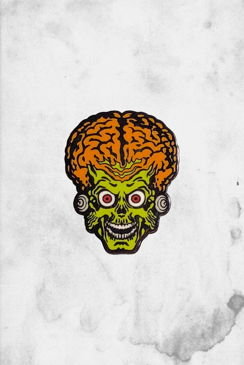 The cult classic Mars attacks is now a collectible enamel pin! This Mars Attacks enamel pin is a must for the horror collector! Each Mars Attacks enamel pin comes in a matching Collector’s Edition Box measuring just over 2″ high and 1.5″ wide and .25″ deep in all its spooky-ness. The lid with the clear cellophane peek-a-boo window comes off and on just like it should.