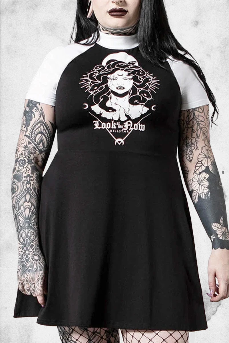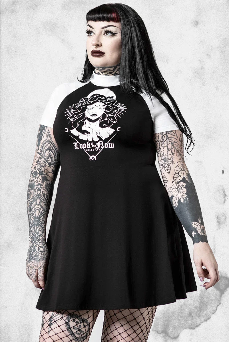 The must-have ‘Medusa’ Raglan dress is conjured from a super soft stretchy material. Features a bold print, white sleeves and neck, skater skirt and a fitted top! It’s a versatile piece that can be worn from dusk till dawn!