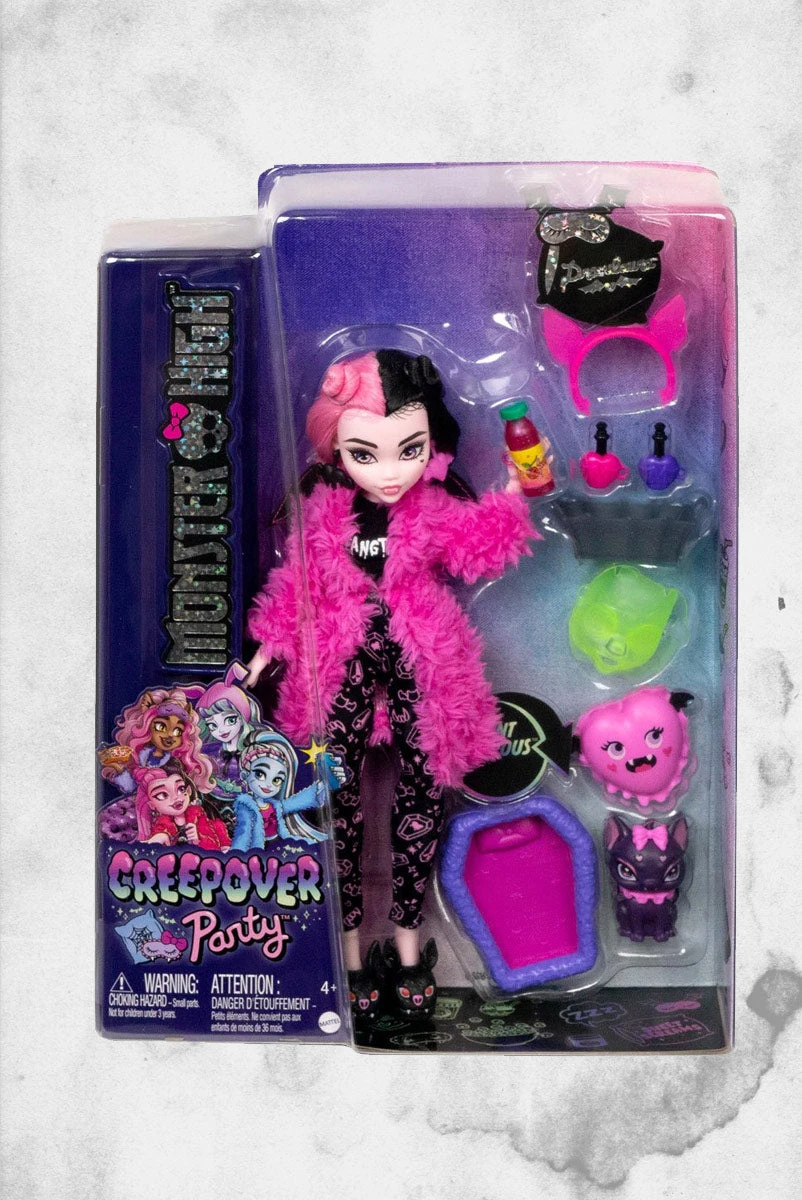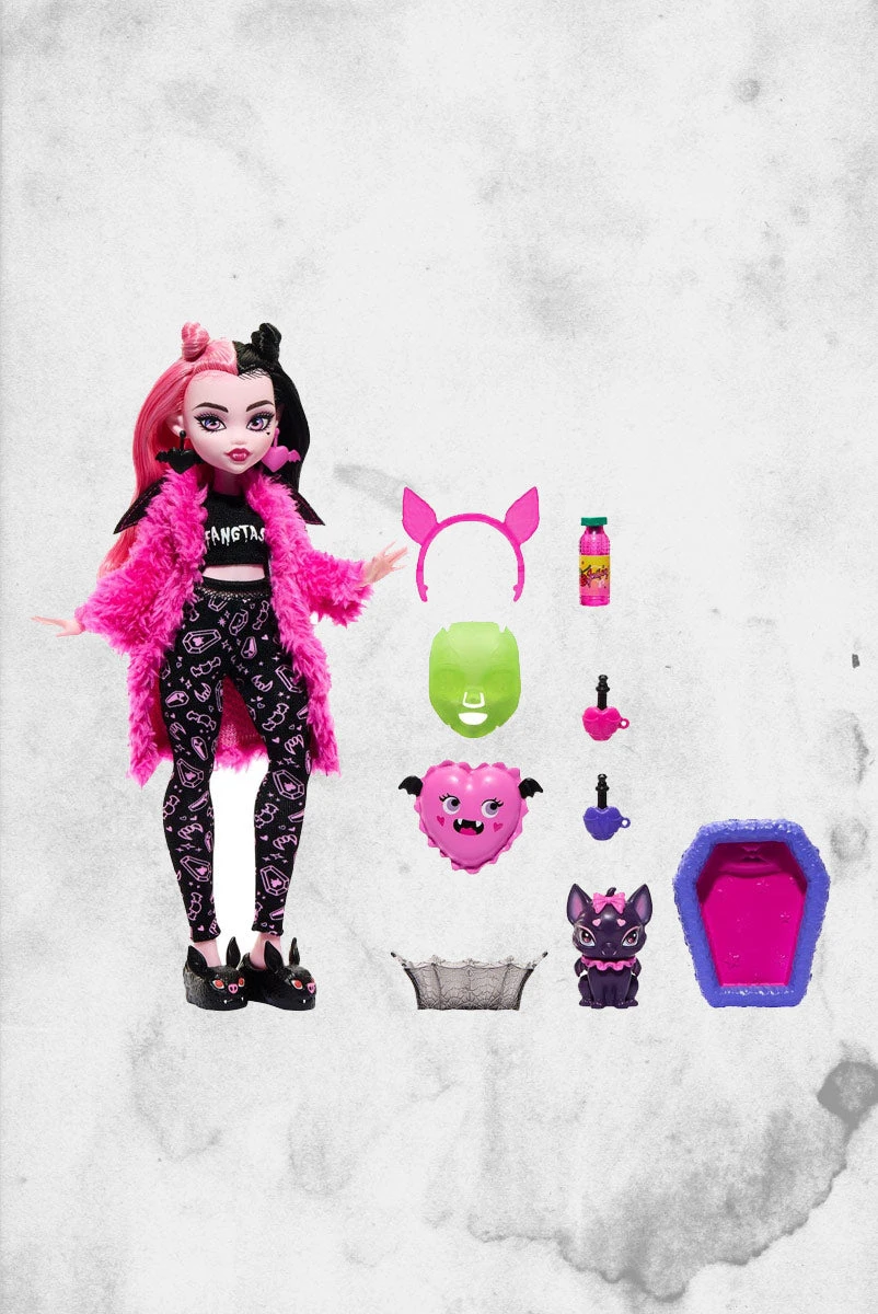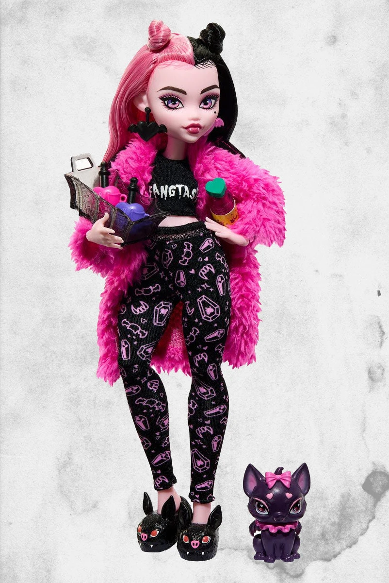 Sure, every slumber party has pampering and makeovers…but throw in some spell books and claw polish and now it’s a really spooktacular soirée! Monster High introduces Creepover Party, a collection of creeperific characters with themed accessories that inspire storytelling and freaky-fab fashion play. Draculaura doll’s shaggy cardigan is fang-tastically cozy! She wears it over a cropped tee and printed leggings with fishnet details at the waist. This vampire is bitingly stylish with her space buns and mismatched chunky earrings! She completes her look with a pink bat-ear headband and creepy-cute bat slippers.