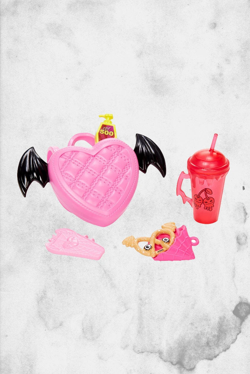 School is back in session, and the Monster High ghouls are showing up in scream-tastic style! Draculaura doll struts down the Monster High hallways in a fang-tastic fashion featuring heart-print shorts and a vampy corset blouse with sheer sleeves. Her freaky-fabulous, vampire-inspired look is complete with sheer, ruffled stockings, pink platform shoes, and a headband and sunglasses with batty details.