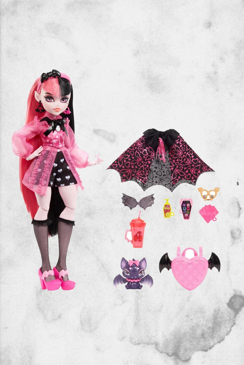 Take Draculaura doll’s look to the next level with a scary-chic cape and accessories. And inspire spooktacular storytelling with her creepy-cute pet bat, Count Fabulous! Doll is approximately 10-inches tall and cannot stand alone