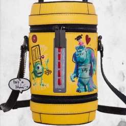 We scare because we care! Fill your laugh tank with your everyday essentials! A cylinder crossbody with a top zip closure, featuring graphics of your favorite monsters. Incorporating a custom diecut charm with “Life’s a Scream!” attached by a ball chain, and industrial zipper details.