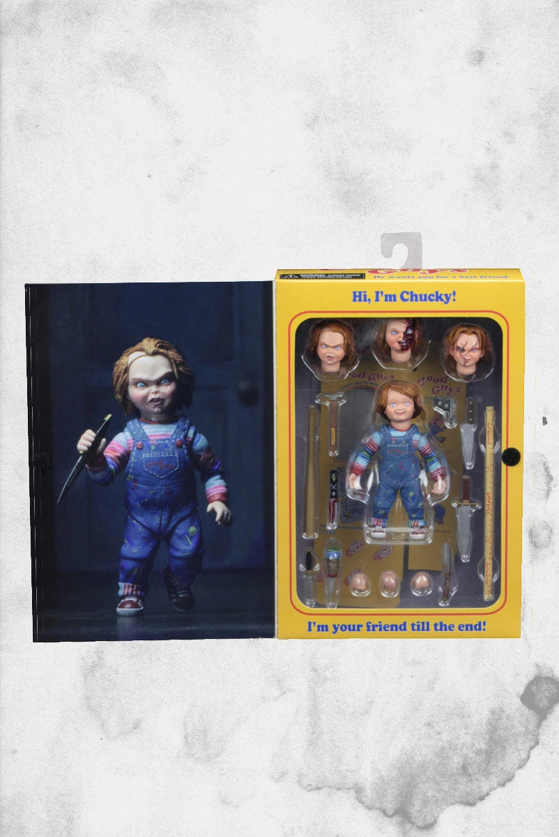 From the classic horror films, the murderous doll inhabited by the soul of a serial killer gets the Ultimate treatment! This definitive version of Chucky comes with a whopping four interchangeable head sculpts, and is packed with terrifying accessories!