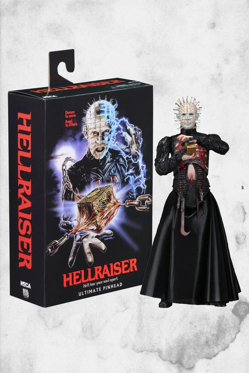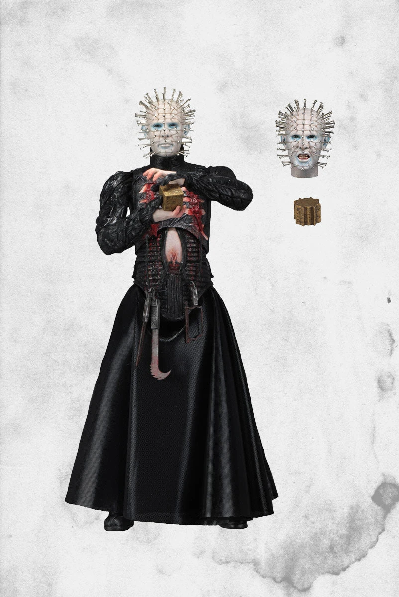 The leader of the Cenobites himself is the latest addition to the Ultimates line. Pinhead features an all-new sculpt and tons of nightmarish detail, from the pins in his head to the tools of torture dangling over the soft goods vinyl skirt. The figure comes with 2 interchangeable heads and both open and closed Lament Configuration puzzle boxes.