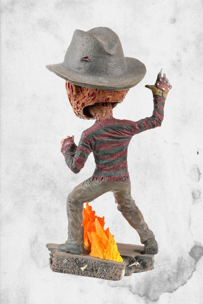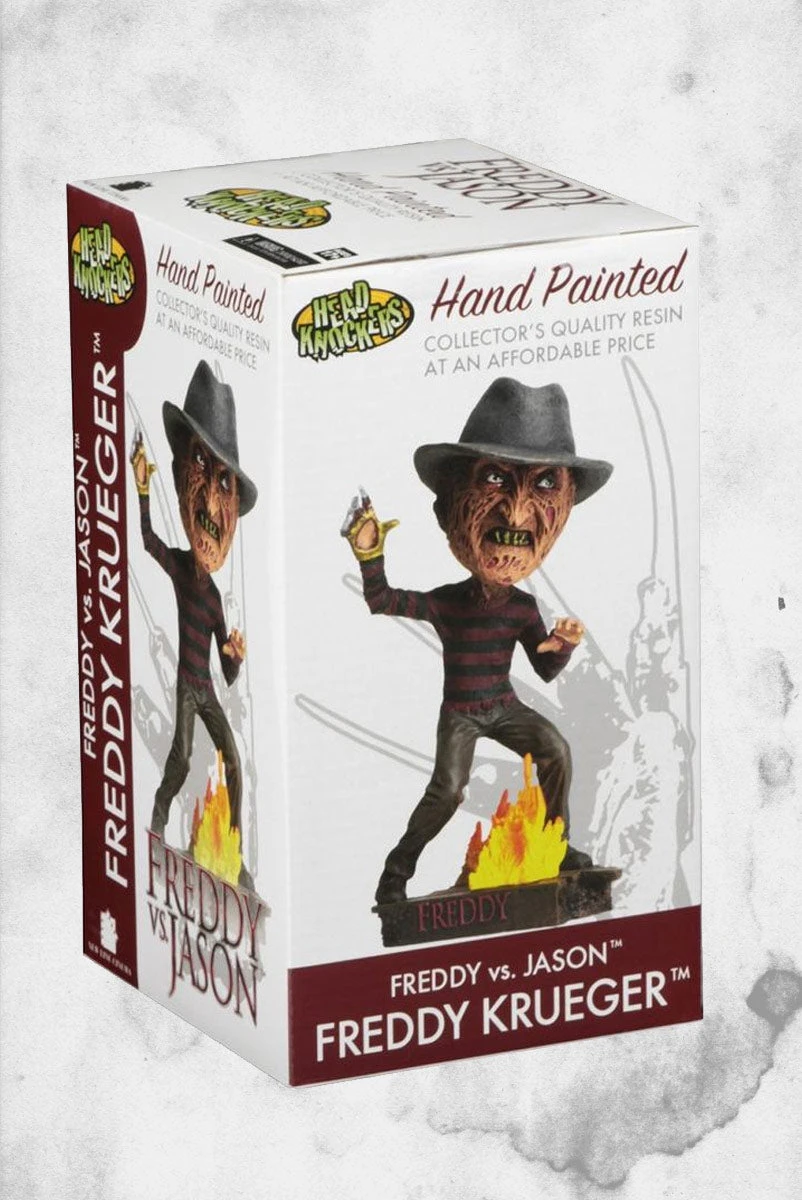 Freddy Krueger is the one of the slayers in the slasher, mash-up Freddy vs Jason. Freddy Krueger and Jason Voorhees return to terrorize the teenage population. Except this time, they are out to get each other, too. This horror great is cast in quality resin and then hand painted with incredible details. He wears his notorious green and red striped sweater, brown pants and his brown fedora. With his menacing grin staring right at you, he holds his arm up ready to strike with his infamous glove of metal knives. His base bares his name “Freddy” and matches the Jason Voorhees Freddy vs Jason Head Knockers
