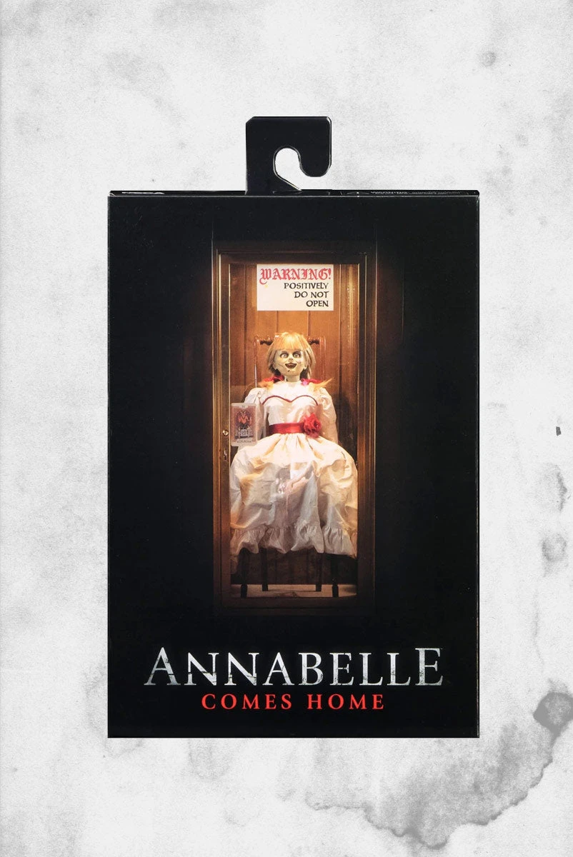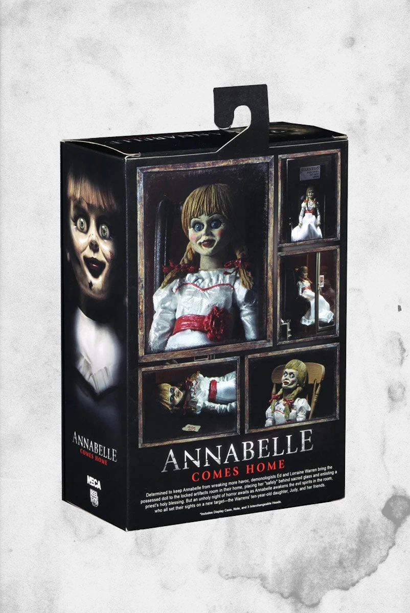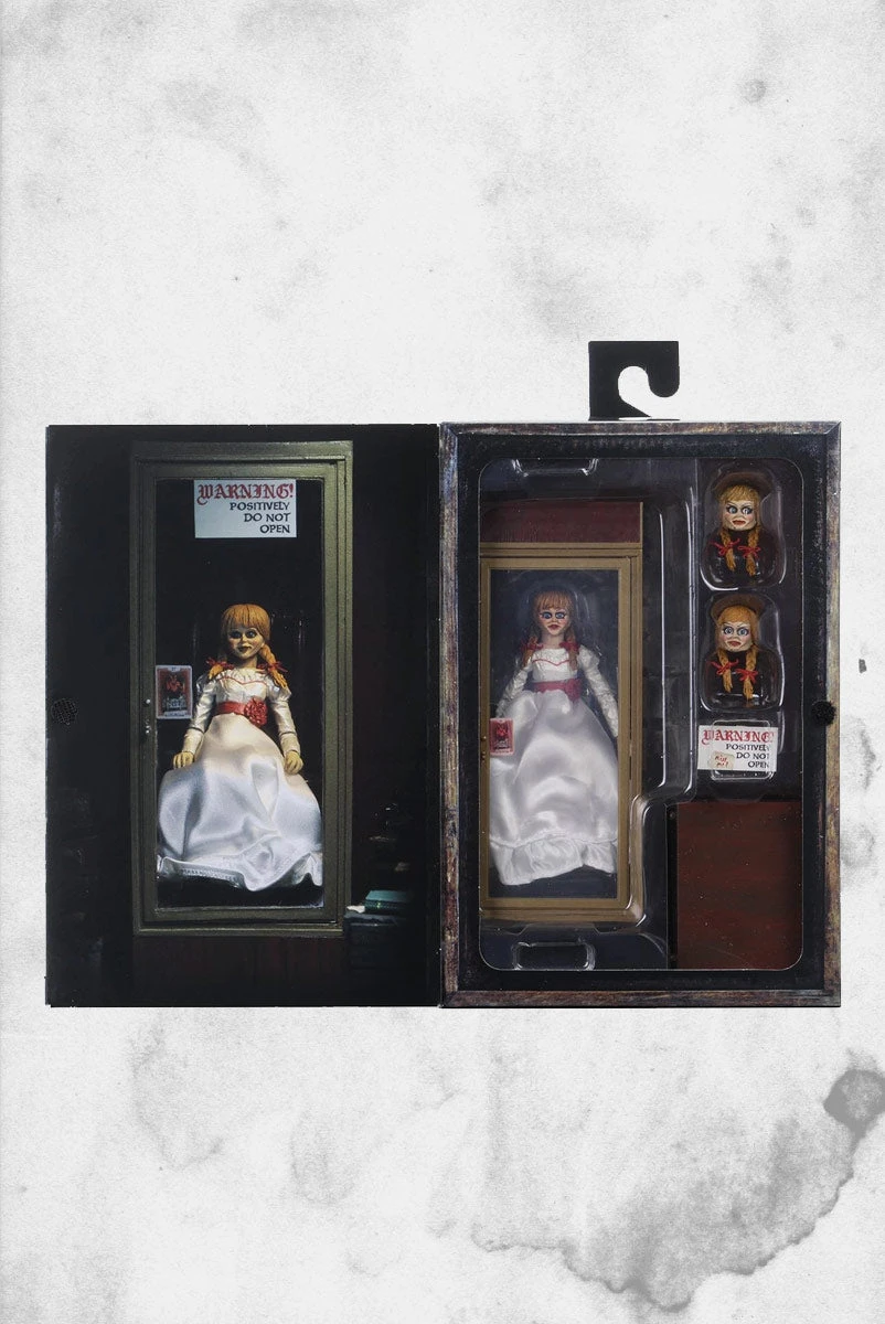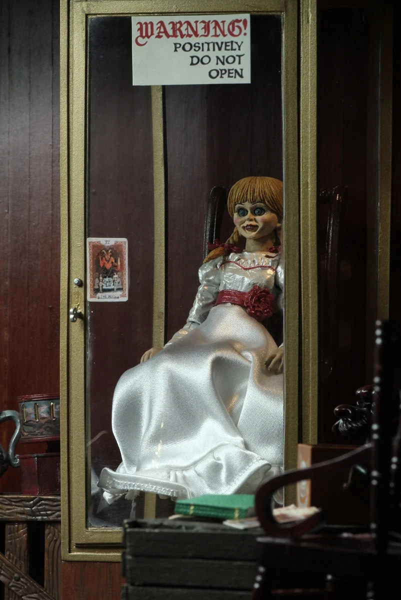 The fully posable figure stands approximately 6” inches tall (7” scale) and replicates the doll’s appearance in Annabelle Comes Home. It features a soft-goods skirt and comes with interchangeable heads, her chair and museum doll case accessories.