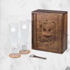 Beautiful, classy, Jack. Crafted of handsome acacia wood, with dovetail joinery and delicate engraving of Jack Skellington and the words “Jack Is Back,” this The Nightmare Before Christmas Jack Pilsner Beer Glass Set can stand alone on your bar top. But under the sliding, removable panel, there are two tall Jack and Sally engraved fluted beverage glasses, two cork beverage coasters, and a deluxe bottle opener! This wonderful set brings back the joy and ceremony of sharing a drink with the one you love and makes an ideal gift for super-fans of Disney’s The Nightmare Before Christmas.