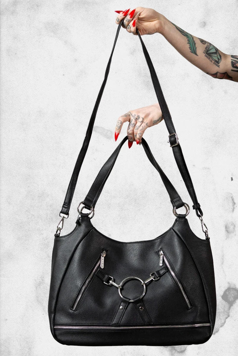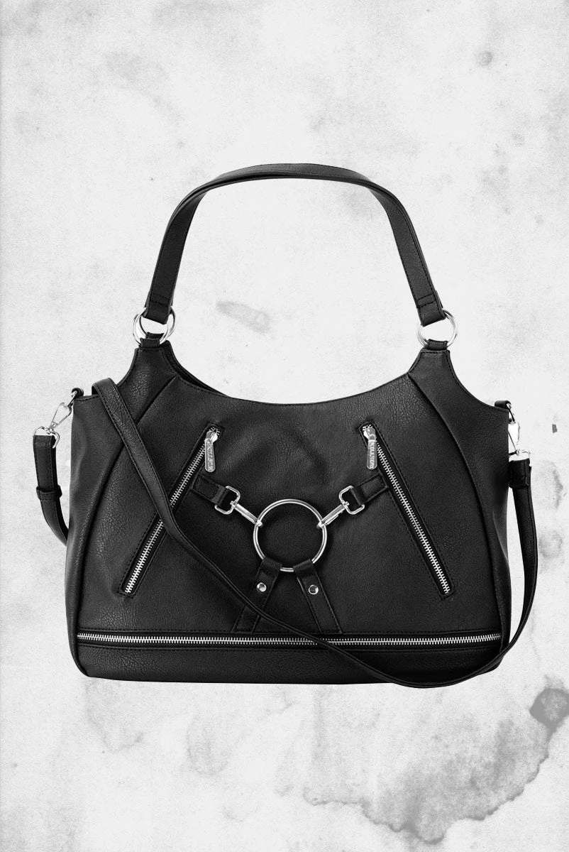 The perfect grab-n-go accessory, the ‘Ramona’ Handbag is punky yet practical. Crafted in luxe vegan leather featuring multiple zip compartments with a statement hard wear details you’ll have no fear of conforming with this handbag.
