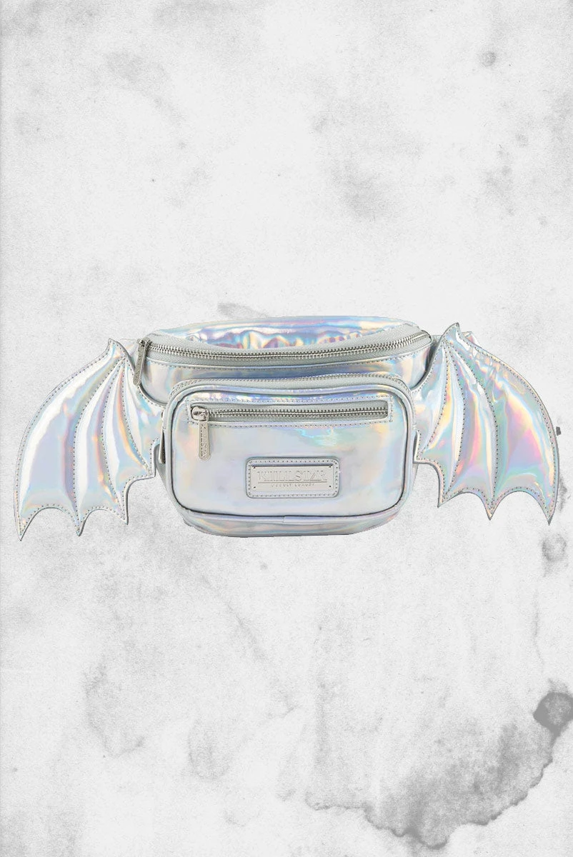 The purrrfect grab-n-go grunge accessory, our “Sickly Sweet” waistbag has been conjured with a faux leather shell with a holographic finish and zip accents. Features crescent moon hardware and wings, the handiest bag for a ghoul on the go.