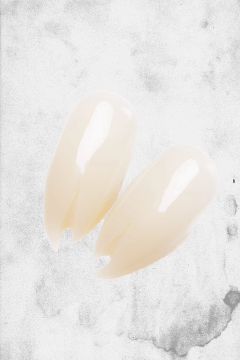 Viper Split Deluxe Custom Fangs are brand new, totally unique, and very wicked! Each fang cap is split into two prongs. They may fit either canines and/or incisors or bottom teeth. Fast, easy, comfortable, and totally realistic. Natural color fang caps are shiny, rigid and beautifully contoured to look great in any mouth. Also available in chrome (GLMVF600).