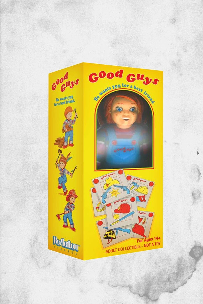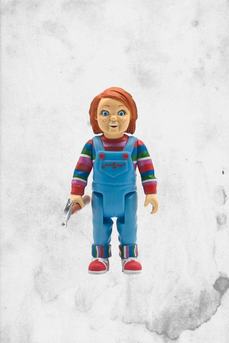 The Good Guys Chucky 3.75” ReAction Figure articulates in five points and comes with hammer accessory. He’s packaged in a prop accurate, scaled-down version of the Good Guys doll box from the movie!