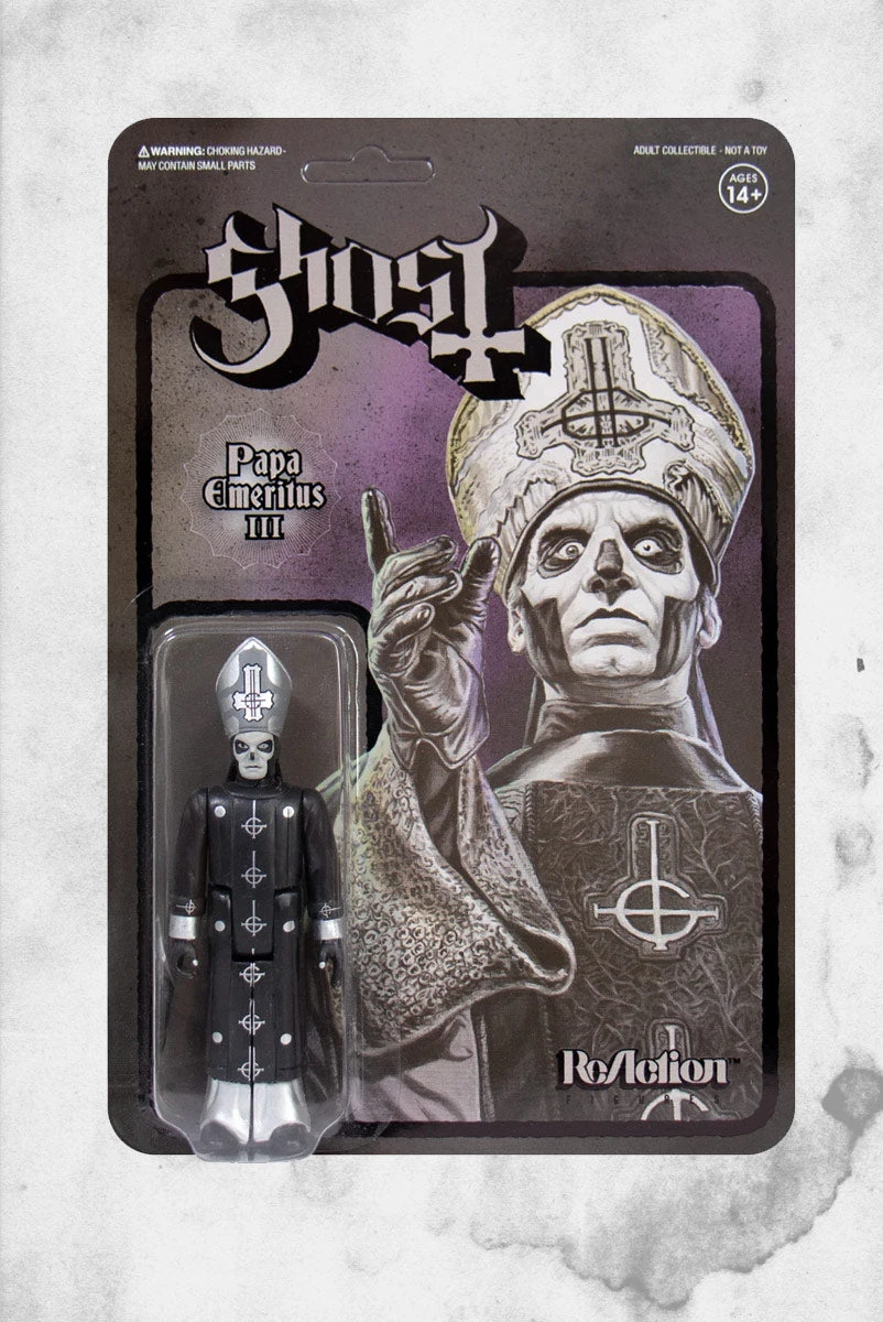 The band Ghost has captured the imaginations of heavy metal fans worldwide with their theatrical music and performances. Papa Emeritus III represents the third incarnation of the band’s charismatic leader. This collector figure is the Black Metal Series by Super 7 & ReAction.