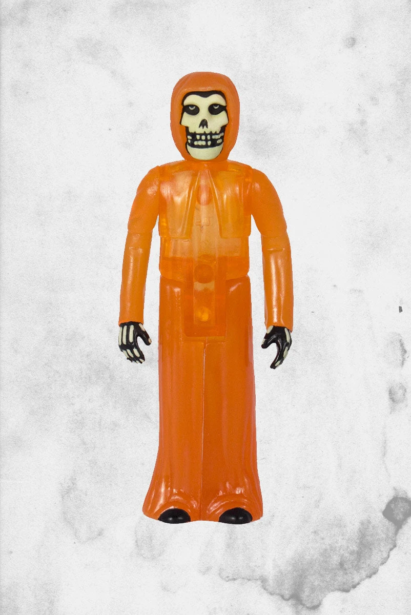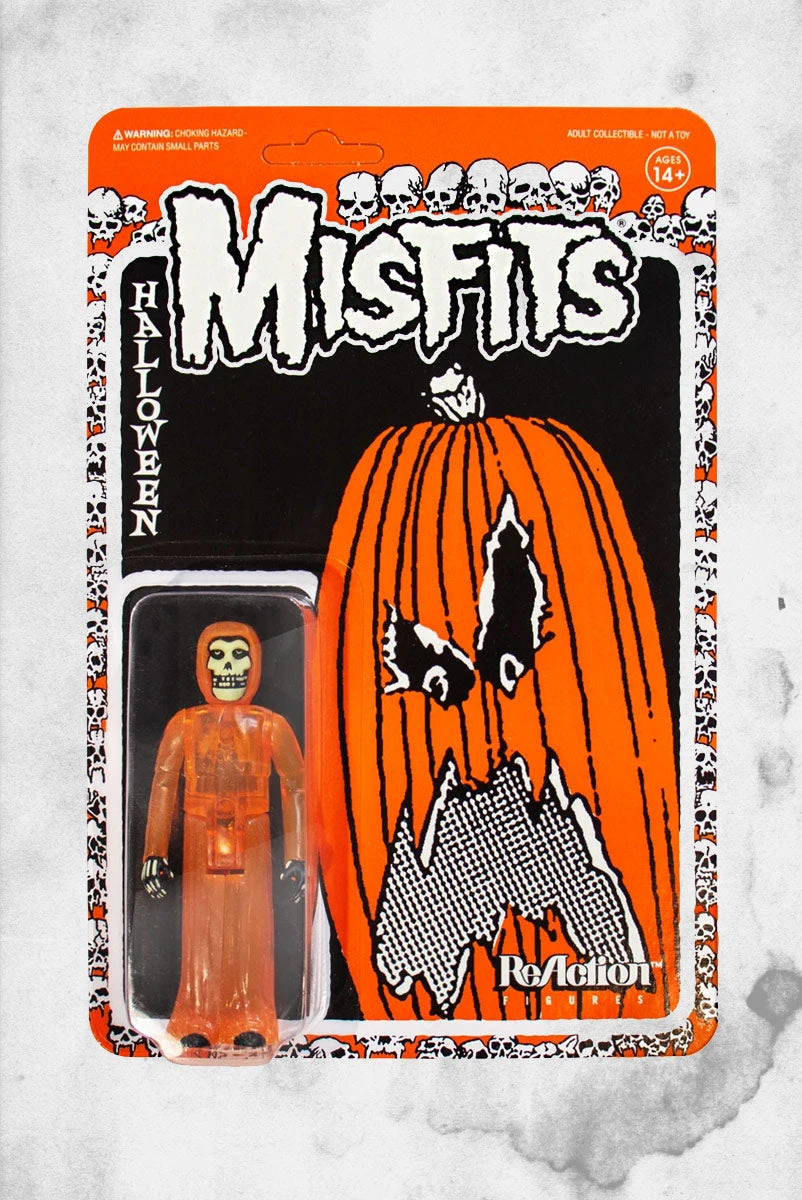 “Bonfires burning bright… Pumpkin faces in the night… I remember Halloween… This Misfits Fiend ReAction Figure collaboration is a must for every collector! Inspired by the band’s 1981 single art and The Fiend’s face and the card back art glow-in-the-dark! The figure itself features an orange transulcent body material