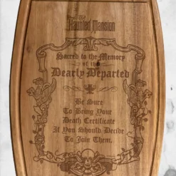 Finely detailed and made of beautiful acacia wood, this one-of-a kind Haunted Mansion Dearly Departed Cutting and Serving Board – Entertainment Earth Exclusive features a recessed juice groove on one side for catching cheese brine, olive juice, or meat juice, and a smooth texture on the other side for food presentation. Inspired by Disney’s popular The Haunted Mansion ghost-train attraction at its parks, it measures approximately 14-inches tall x 9-inches wide x 4/5-inch thick