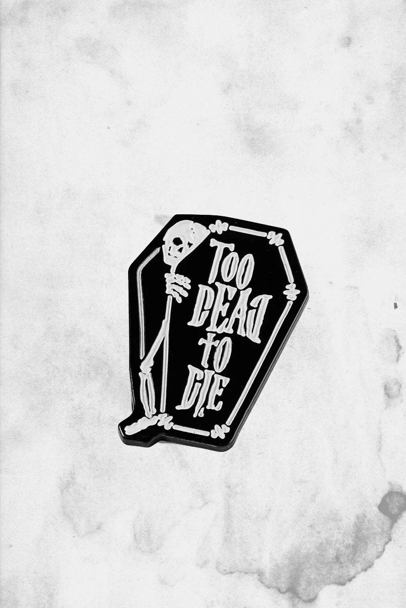 Statement coffin-shaped too dead to die lapel pin, in white and contrasting black enamel. The ideal way to add some creepy vibes to yer fav looks!