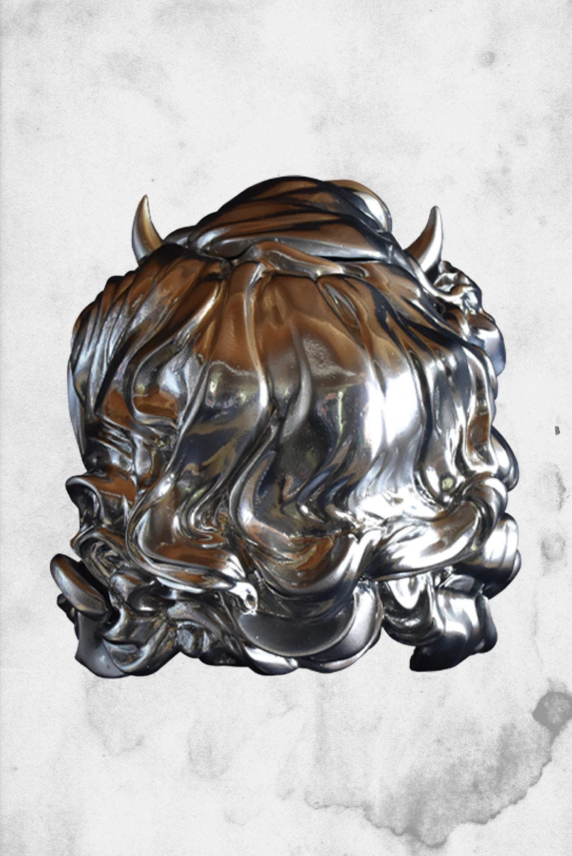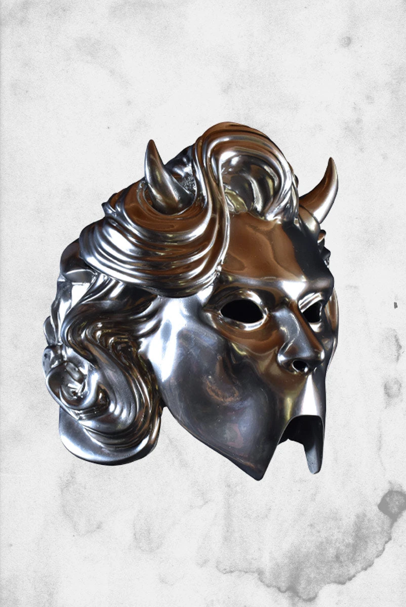 Sculpted by Jerry Constantine, the Artist that makes all the masks for the band. This mask was derived from the stage used master molds, is made in the same exact materials and uses the same exact paint and production process as the Ghost Chrome Ghoulette Nameless Ghoul Masks as seen on A Pale Tour Named Death. This amazing mask is made out of resin.