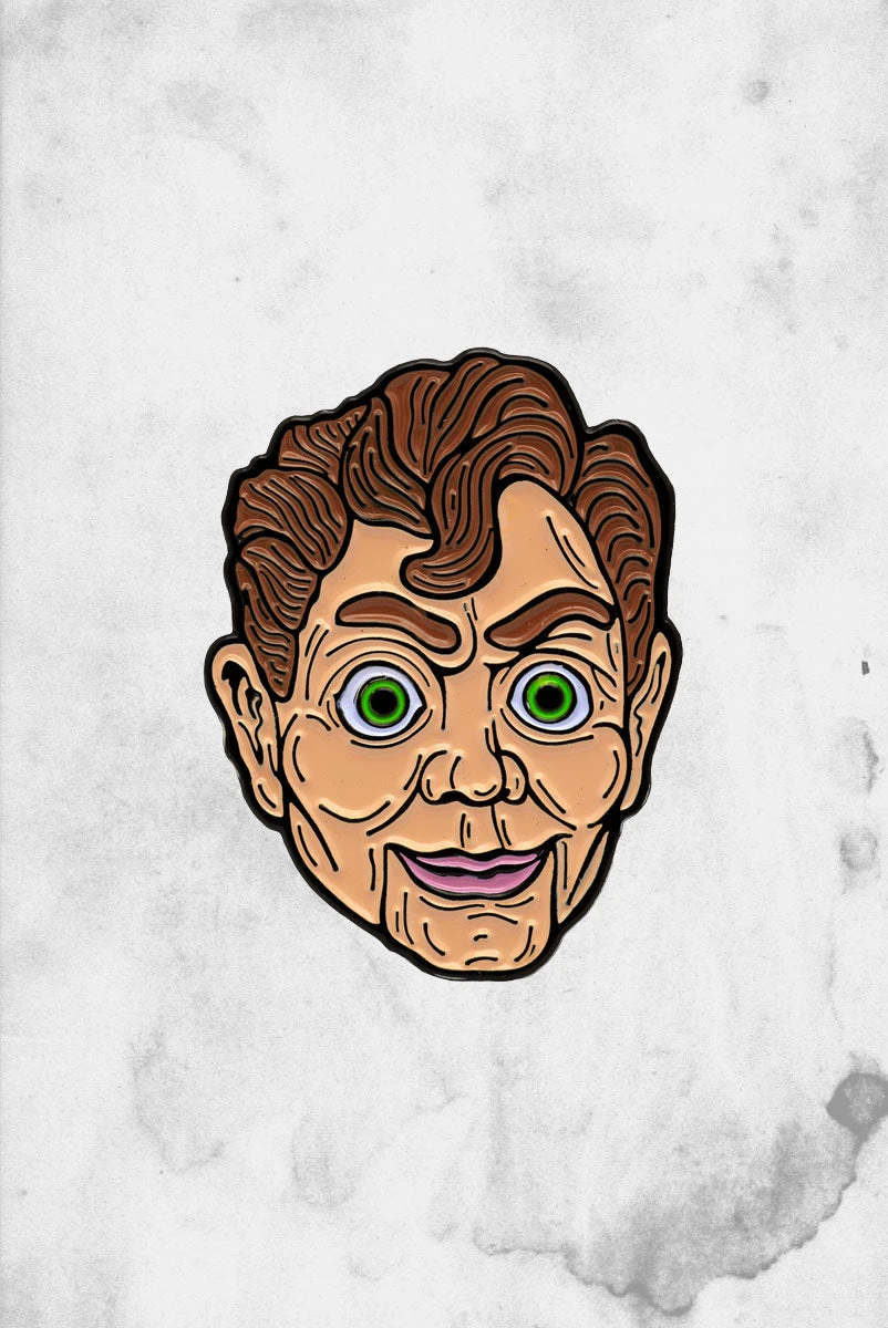 This childhood classic Slappy the Dummy from Goosebumps full color 1.5″ wide soft enamel pin, comes with a double rubber clutch backing and is perfect to put on a shirt, jacket or backpack.