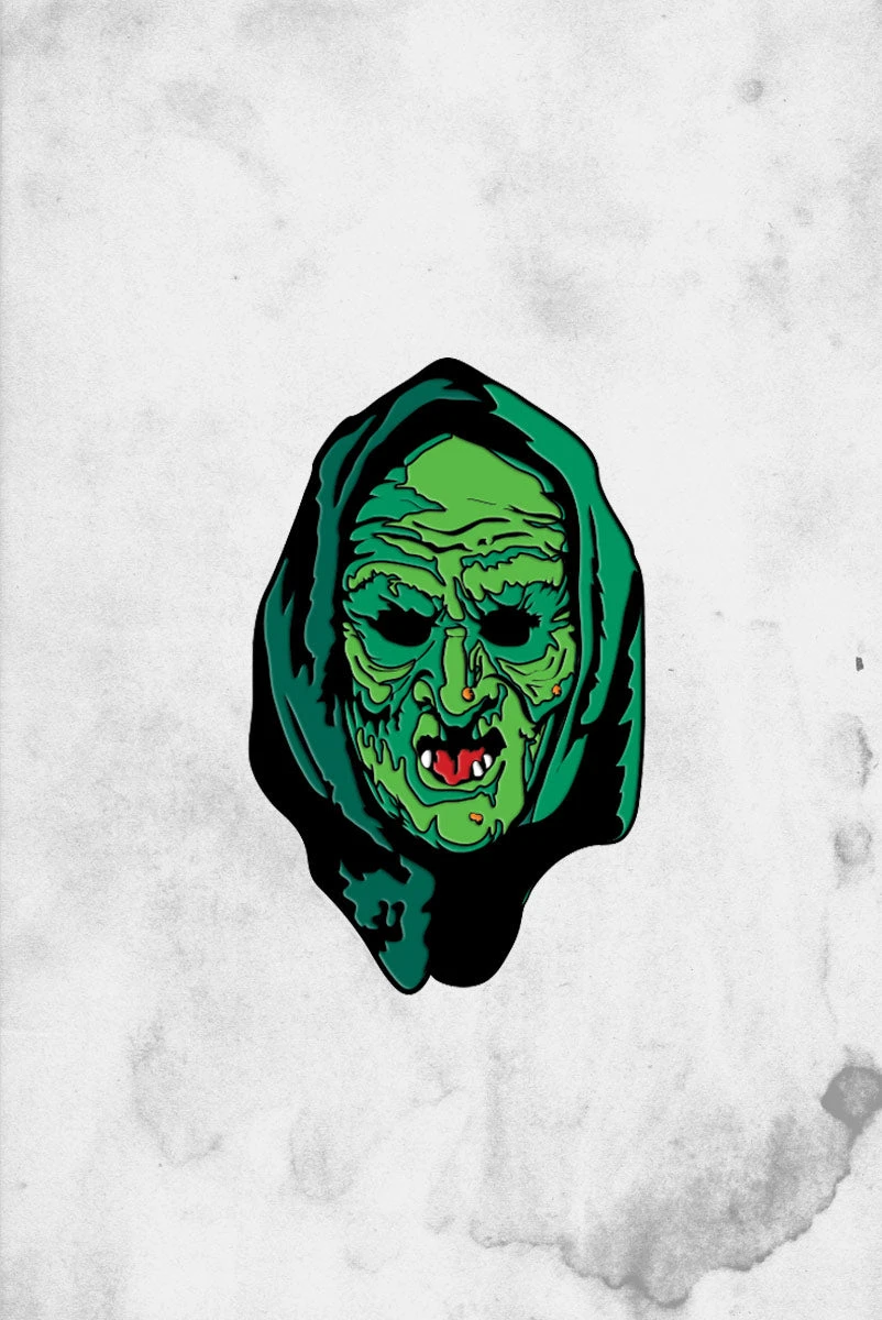 Get ready for Halloween season with this amazing Silver Shamrock Witch pin from the classic Halloween III: Season of the Witch. This full color 2″ wide soft enamel pin is the perfect accessory to put on a shirt, jacket or backpack.
