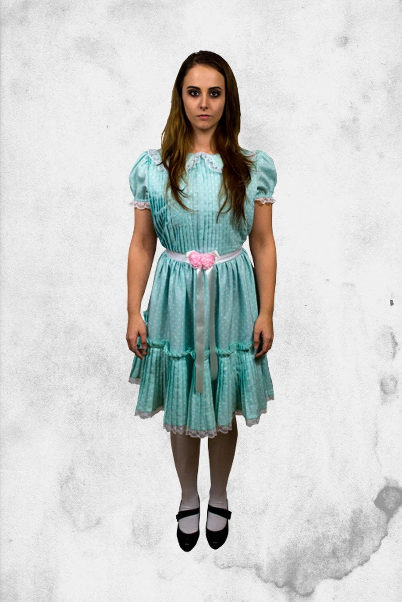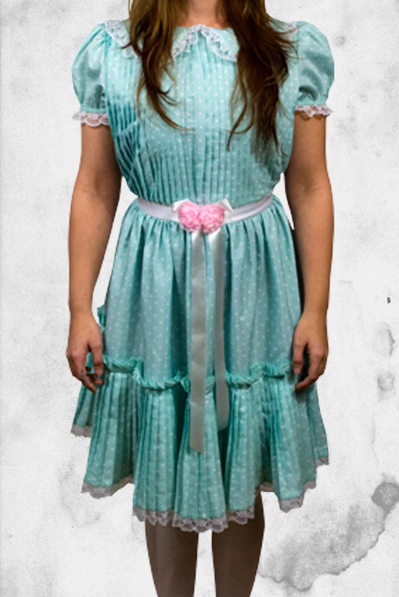 Based on hundreds of images of the actual screen used costume, this is the ultimate replica of the dress worn by the Grady Twin before their father “corrected them” in the Stanley Kubrick classic, The Shining. Every detail of the costume is here, including the true off camera color of the dress, to the two pick roses in the center of tie.