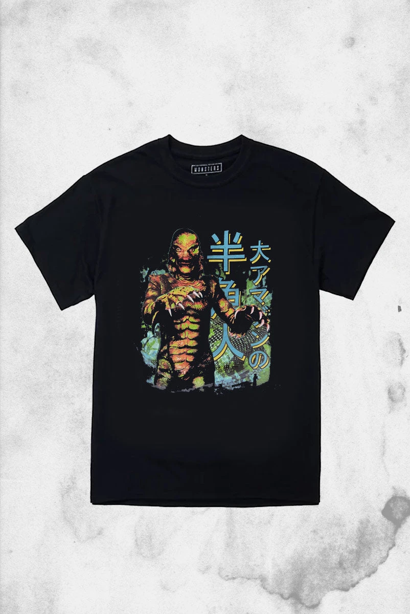 Make your horror tee collection more international with this black tee from Universal Monsters series. Printed with a stylized image of The Creature from the Black Lagoon with the Japanese text down the side.