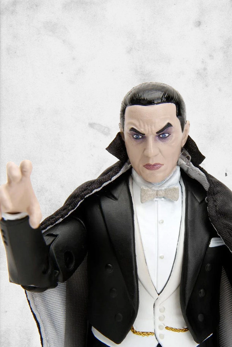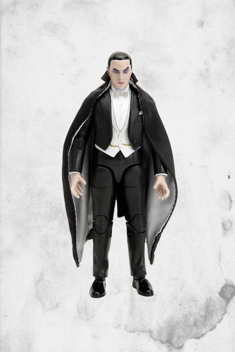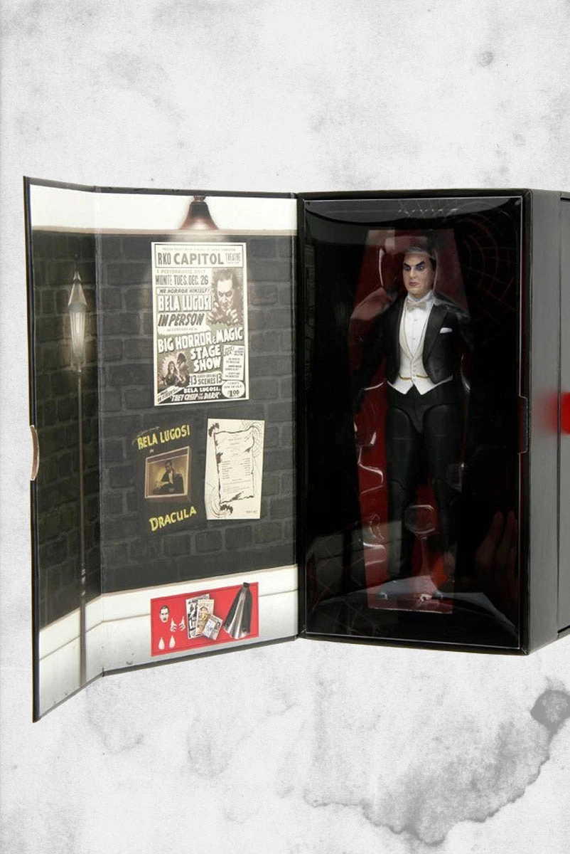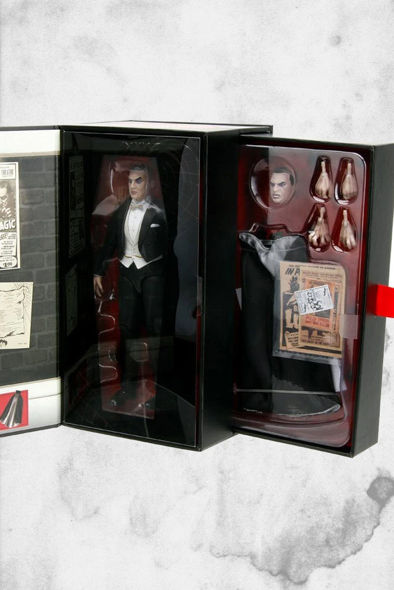 Bela Lugosi in his unique and iconic portrayal of Count Dracula and is intricately crafted in dynamic posing in 1:12 scale. This spectacularly sculpted 6-inch scale action figure features premium paint details of the stage and silver screen star. The fully articulated action figure comes in premium collector packaging with alternate head, 2x pairs of hands, and replica handbills. Bela Lugosi is Dracula…and he bids you welcome. The packaging features a coffin look with a and closed box “coffin” packaging with a 5th panel and a slide out drawer.