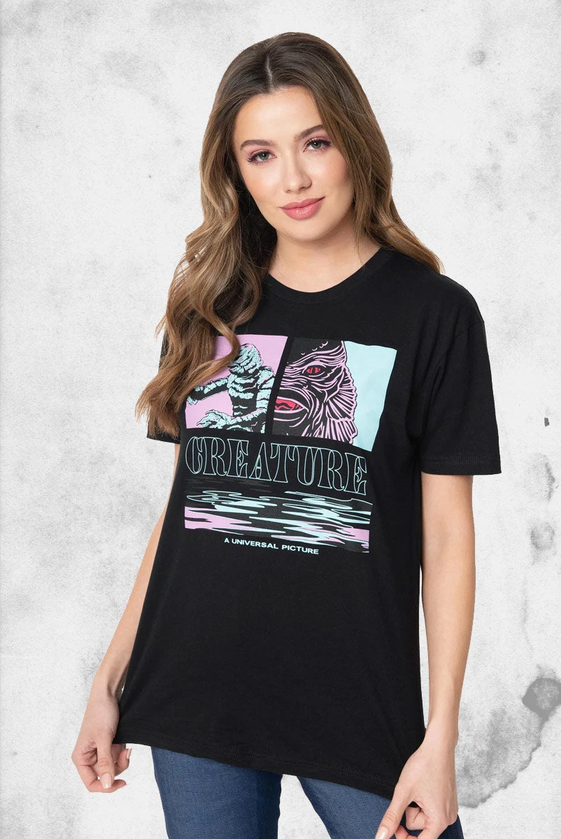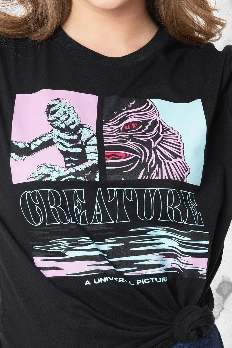 You will have your revenge, dears! A frightening tribute to Universal’s Classic Monster, The Creature From The Black Lagoon, this spine-tingling black tee from Unique Vintage features the iconic graphic presentation of the original horror show in light pink and blue screen print. Crafted in a long and relaxed unisex design, this cotton separate boasts a classic crew neckline and sweet short sleeves. It’s safe to go back into the water, dears! Trust us!