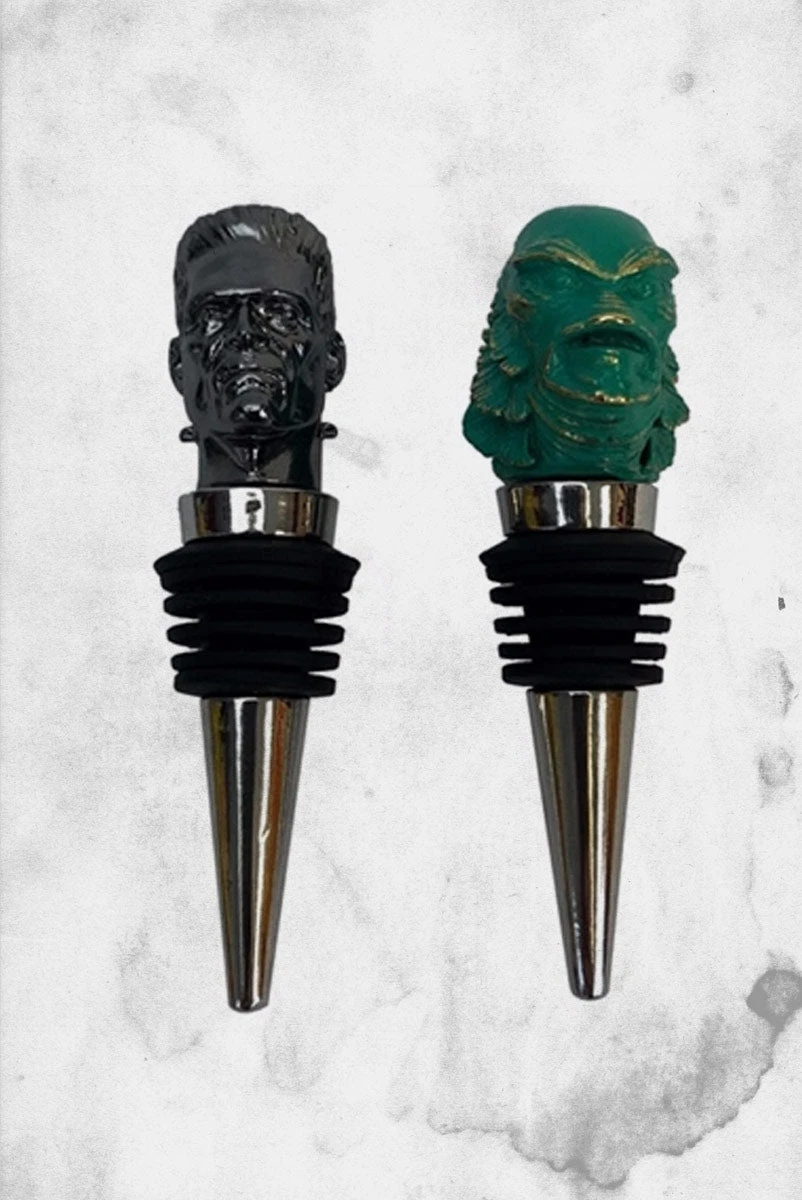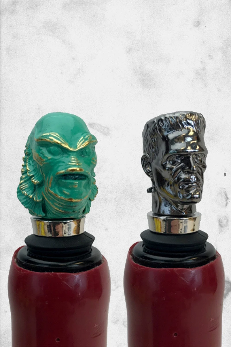 Modeled after 1954’s The Creature from the Black Lagoon and 1931’s Frankenstein, each Universal Monsters™ wine stopper is artfully sculpted in solid metal and has a chrome-plated base with a rubber stopper fitting. The Creature is finished in an antique brass effect, while Frankenstein’s Monster features a rich dark chrome plate. Both come packaged in a gift/storage box.