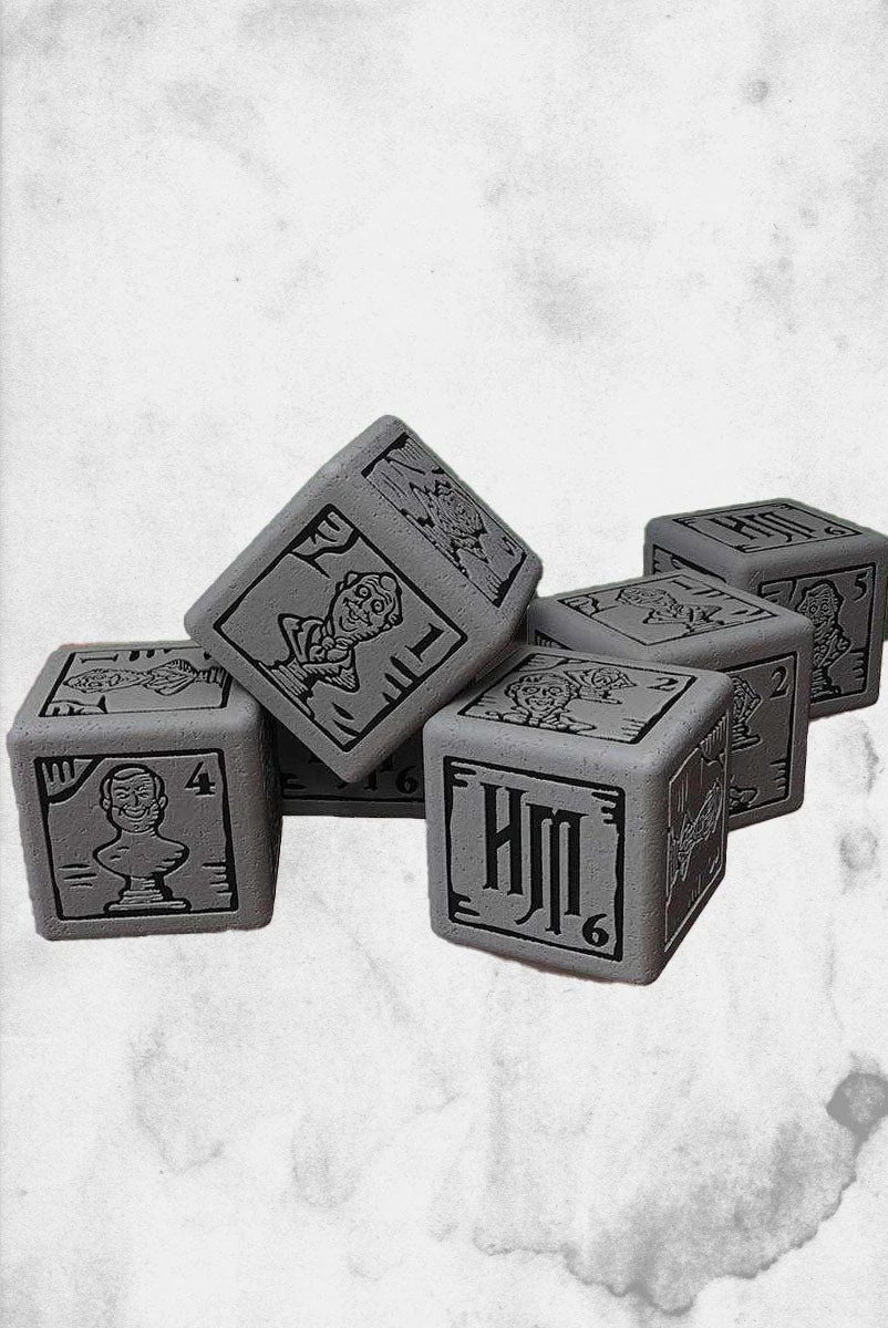 Take a handful of the “999 happy haunts” to your next game night with the Disney Haunted Mansion Premium Dice Set! This engraved, stony gray 6-sided dice set features the iconic singing busts and symbols from the classic theme park attraction stored in a collectible wallpaper-patterned tin carrying case.