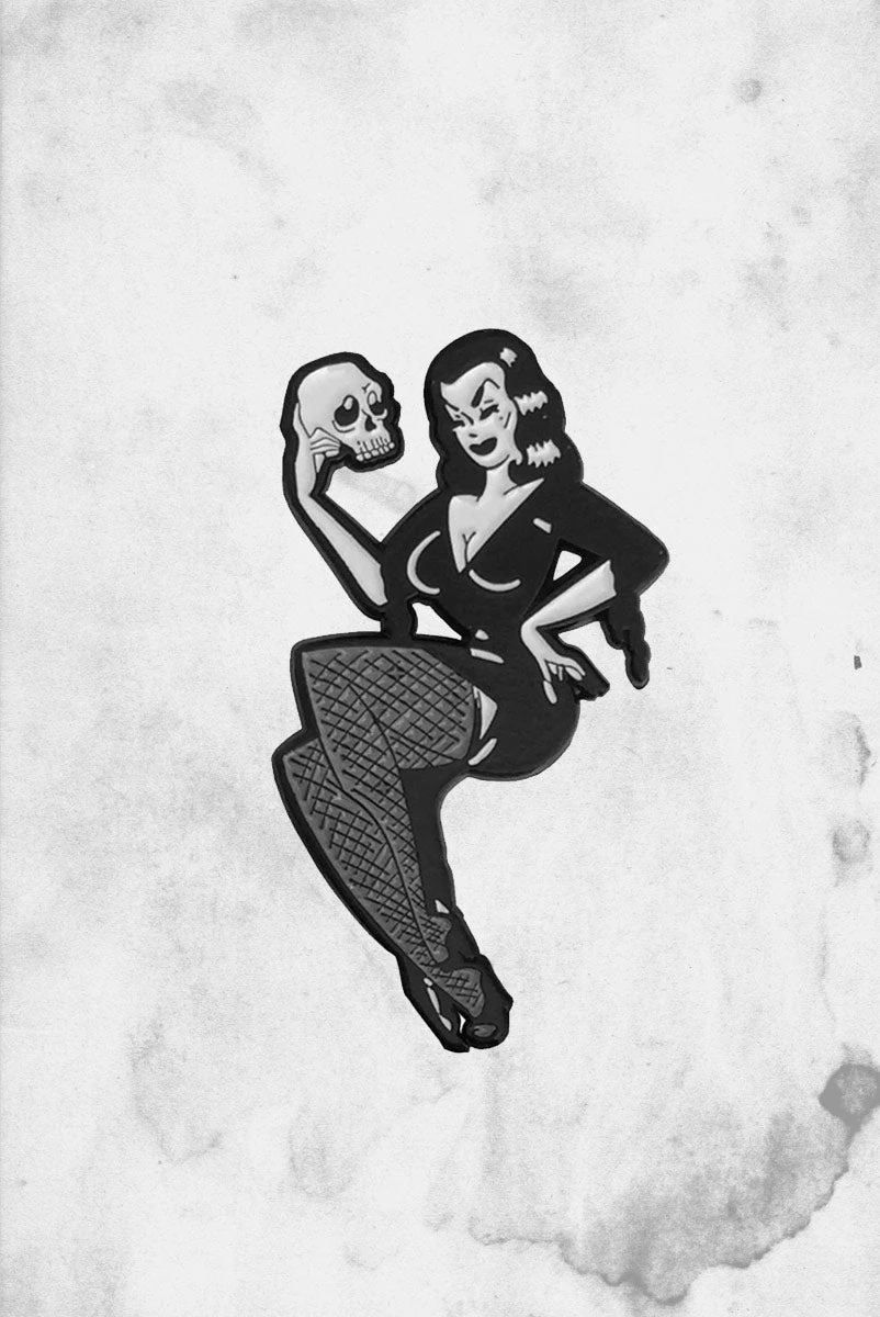 Officially licensed Vampira holding a skull enamel pin is perfect for your jacket or backpack to show your spooky-side everywhere you go.
