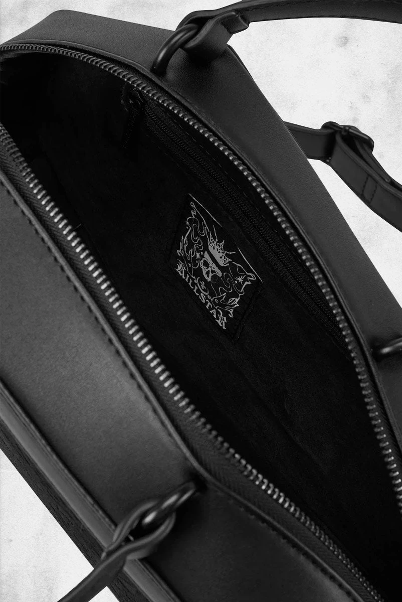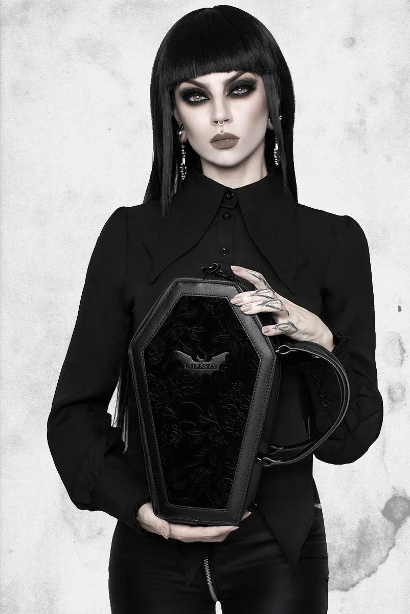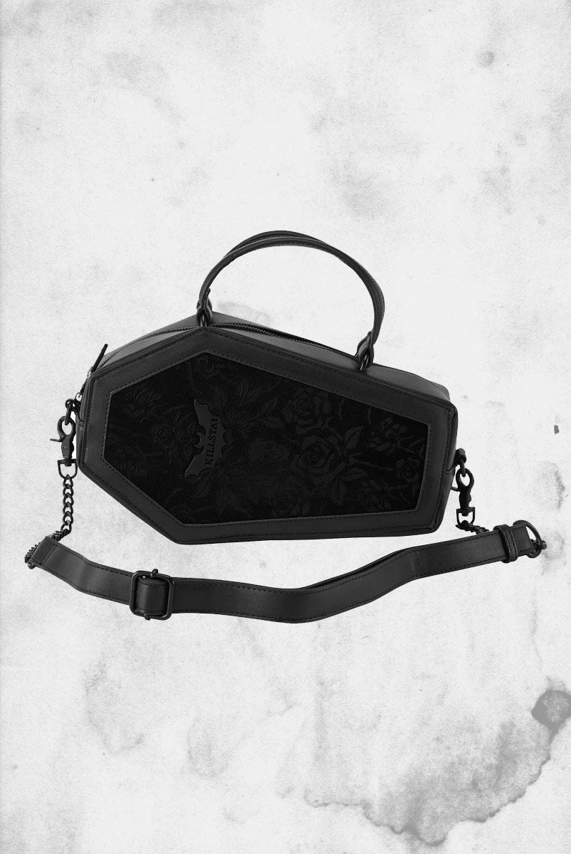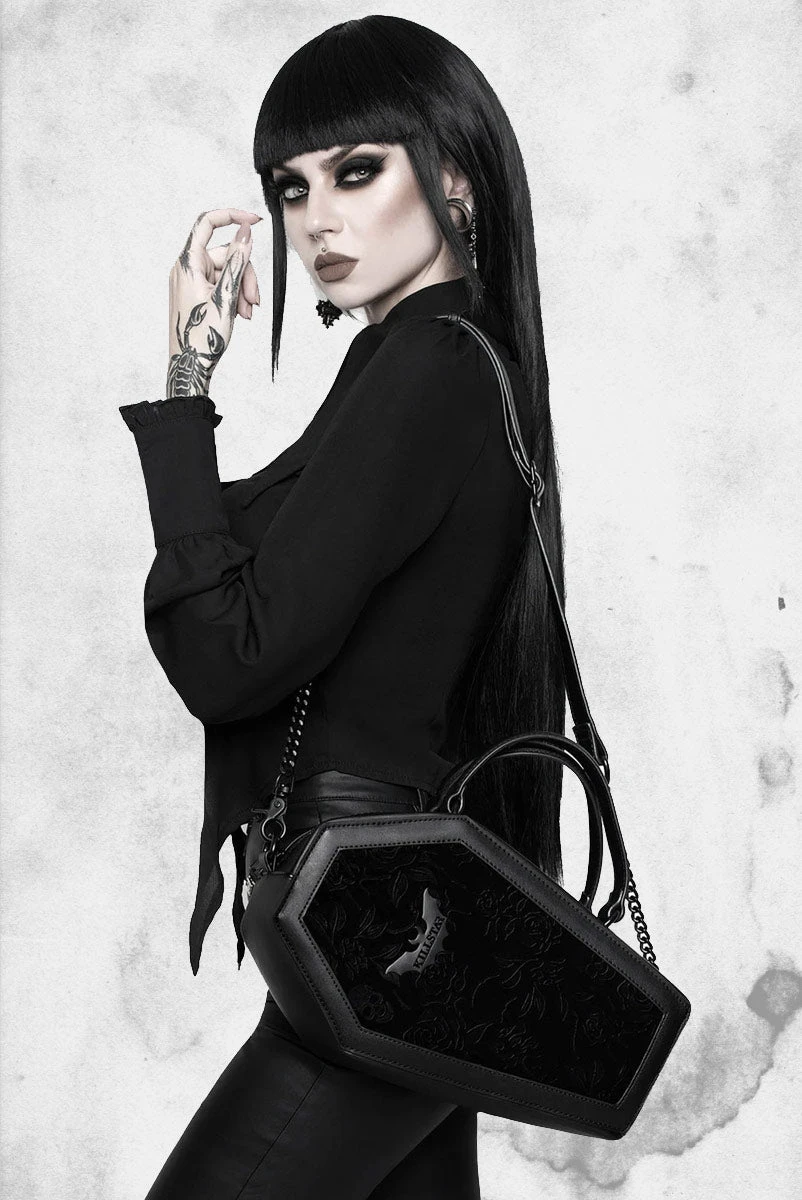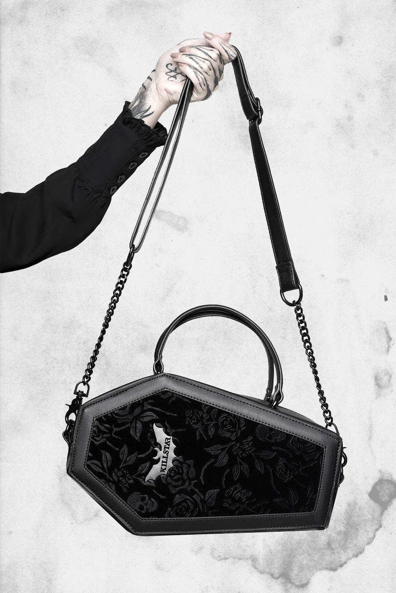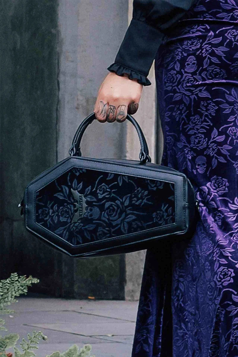 Make their blood curdle with our ‘Vampire’s Kiss’ coffin handbag – a dark combination of luxe faux-leather and custom-made burnout velvet complete with a sleek coffin design, the perfect bag for any vamp! Finished with zip closure with cross hardware and a bat plaque. Big enough to fit all yer essentials for a day out of the castle!