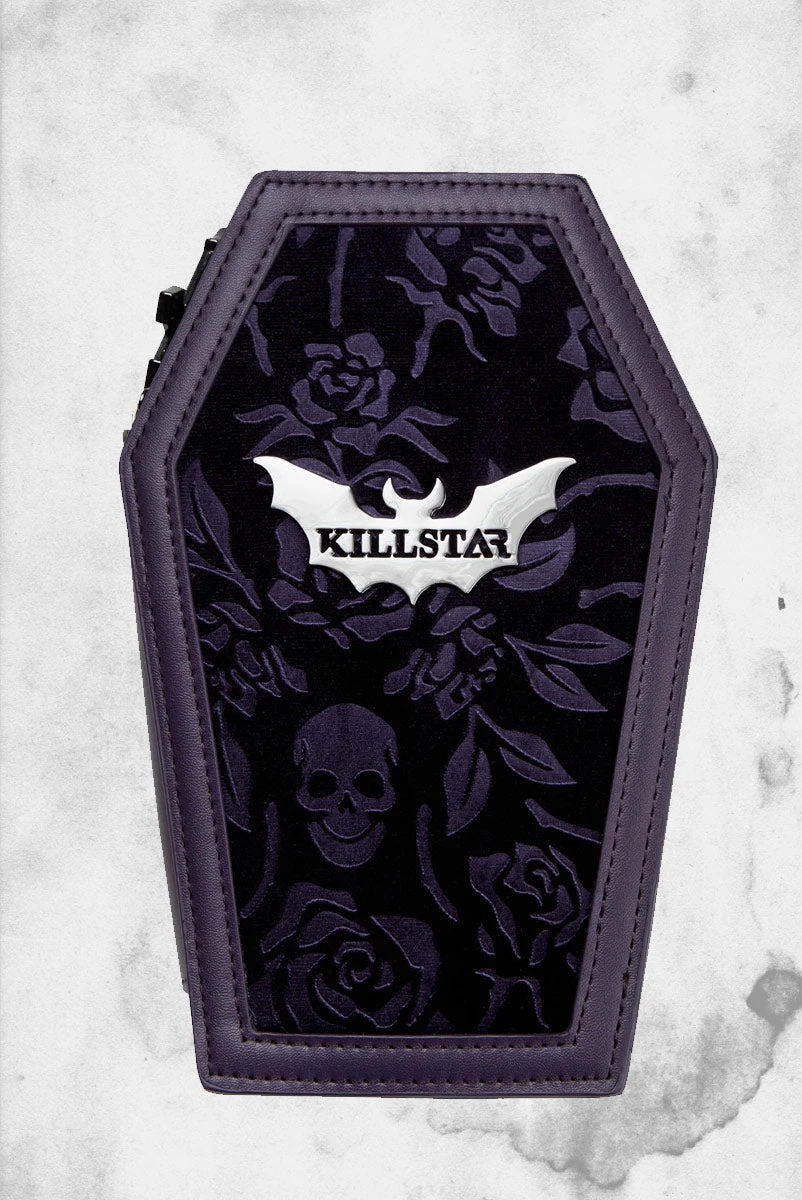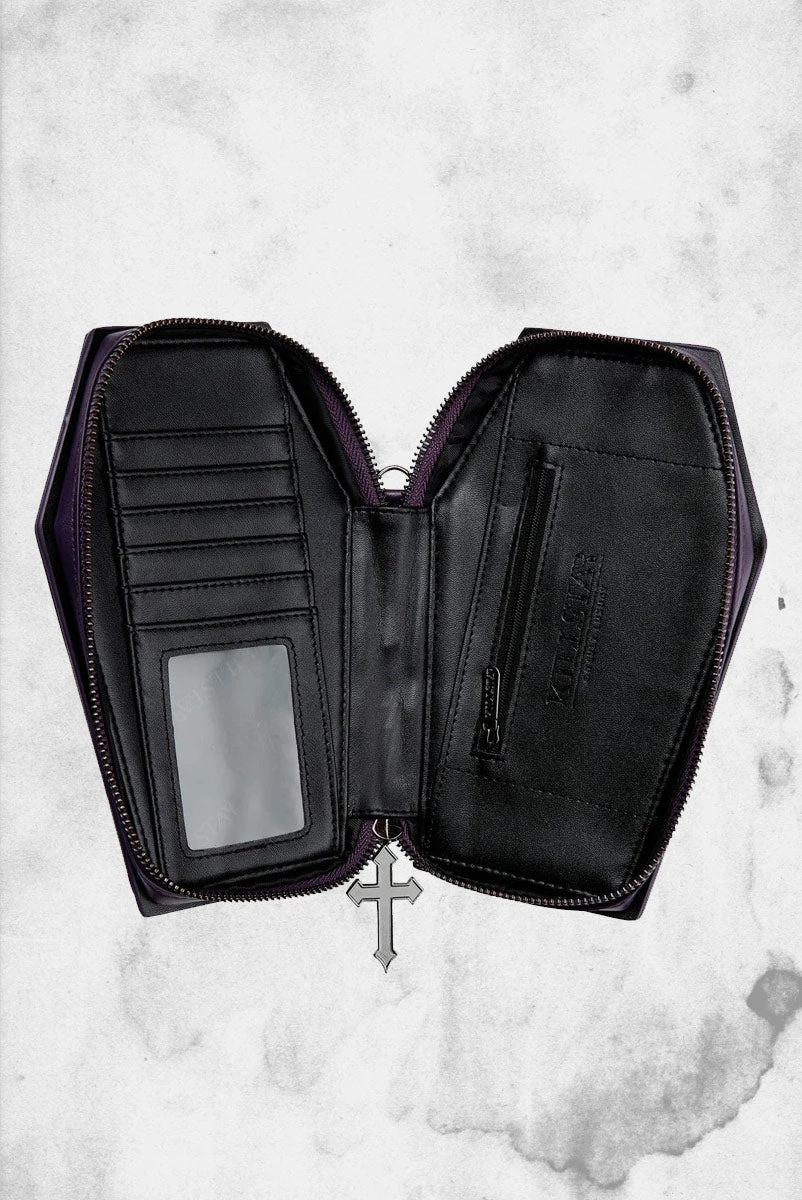 Complete yer look in killer style with our ‘Vampire’s Kiss’ coffin wallet – a dark combination of luxe faux-leather and custom-made burnout velvet complete with a sleek coffin design, the perfect wallet for any vamp! Finished with a zip closure and a bat plaque. Large but still lightweight, fits yer cash, stash, and magical amulets.