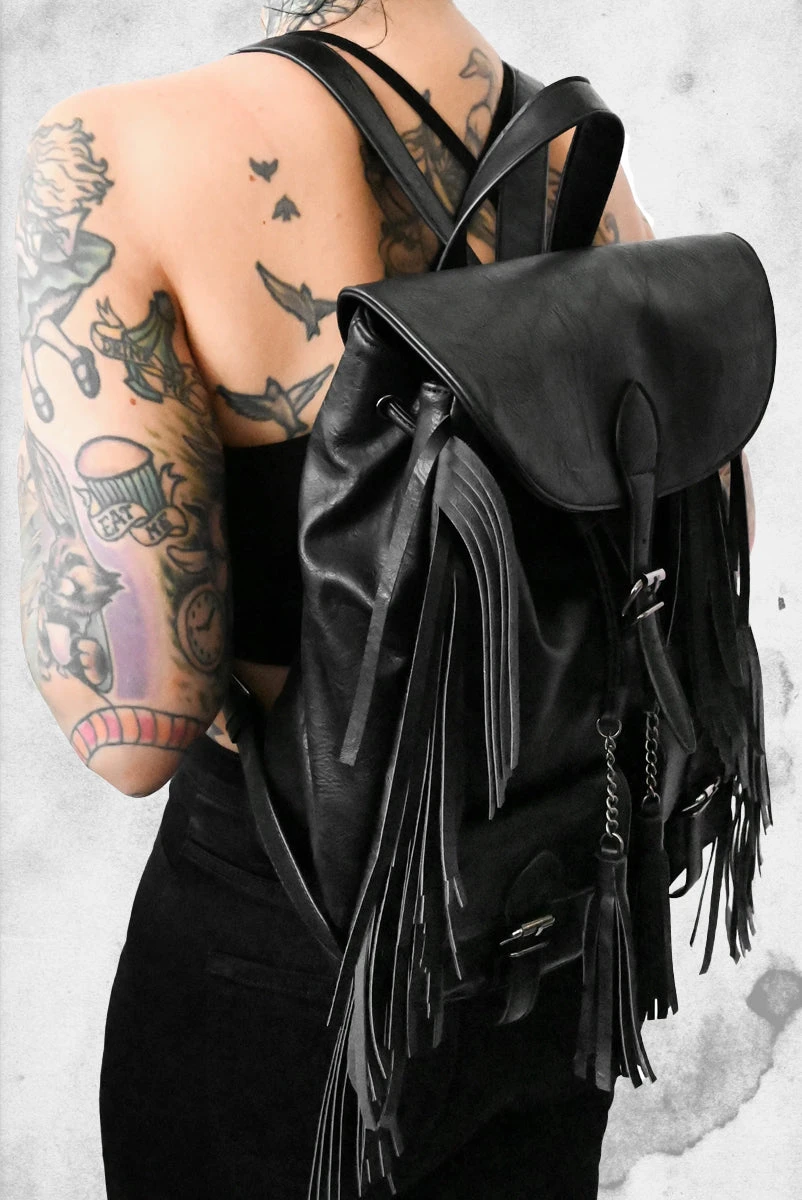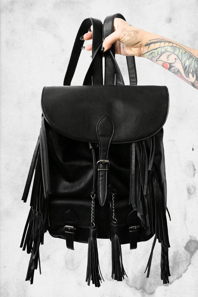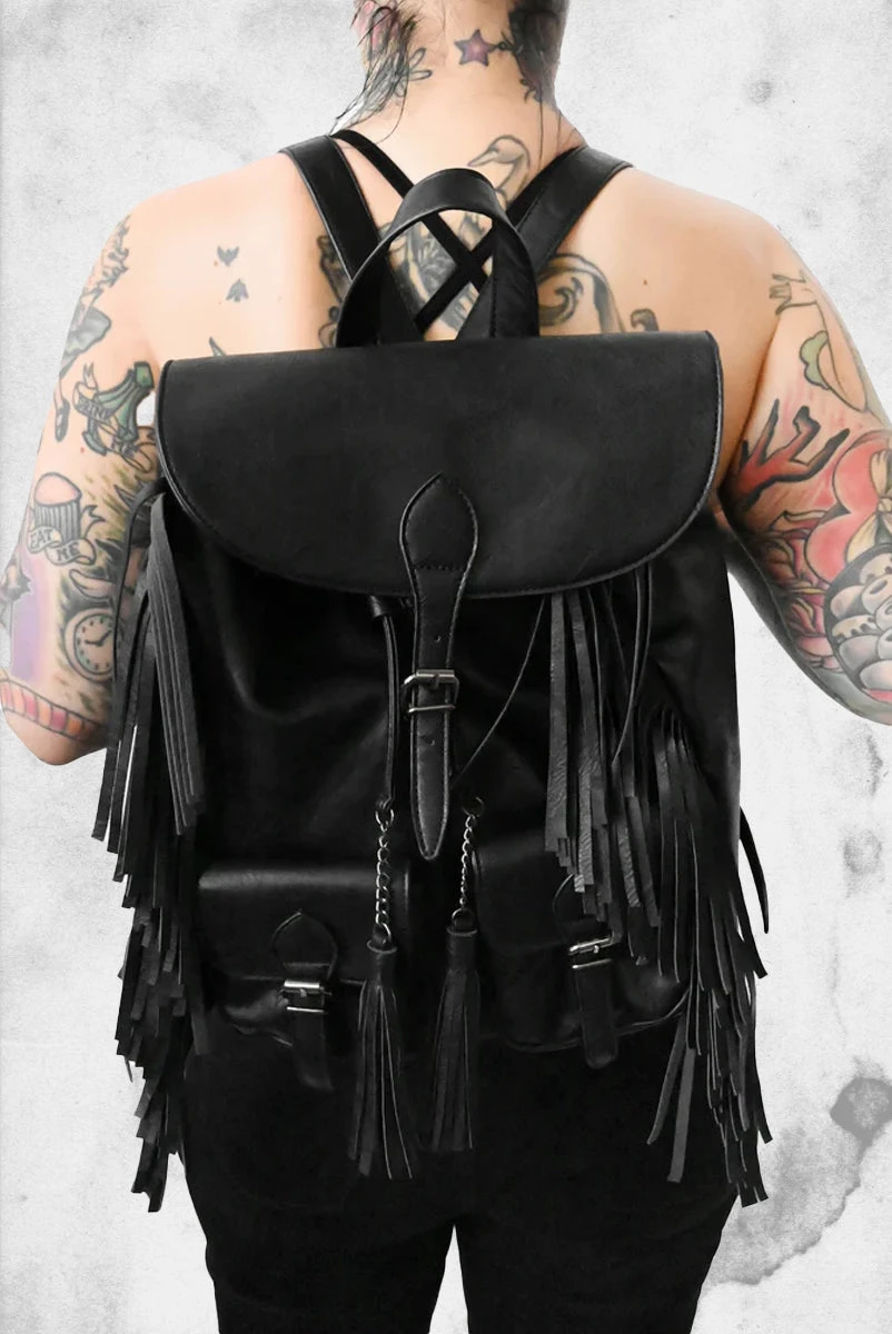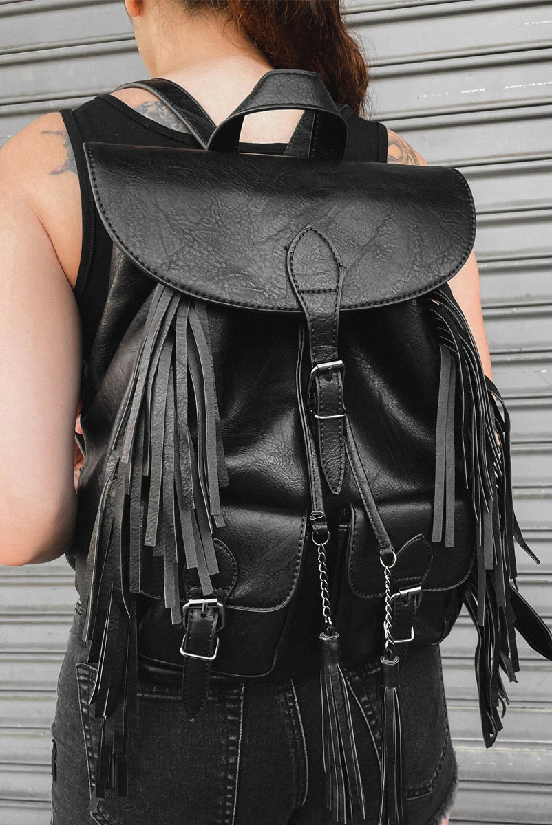 Outside has 2 functioning buckle closure pockets and fringe side details.