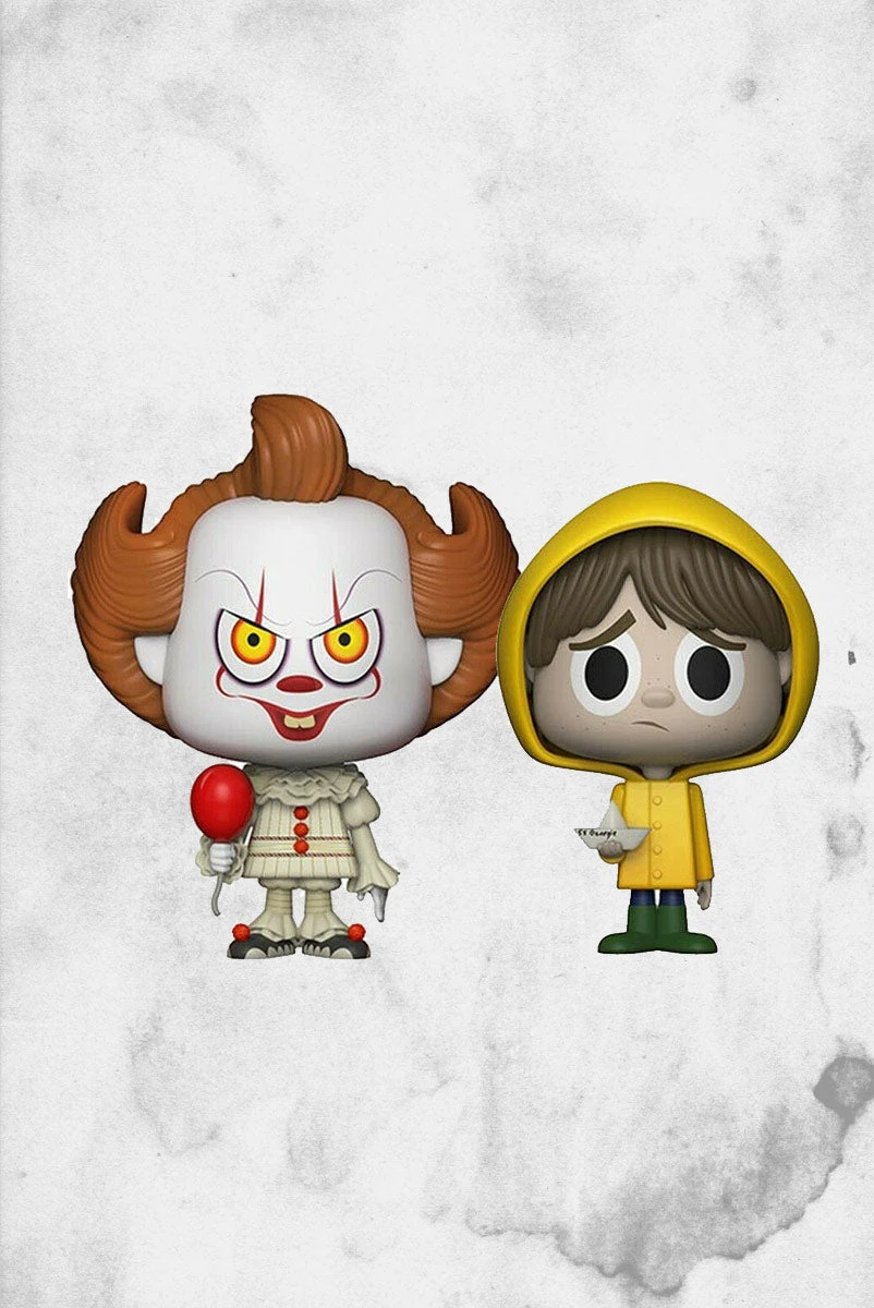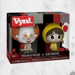 Will Pennywise convince Georgie to float? This vinyl pair features Pennywise holding his enticing red balloon, and Georgie — complete with his raincoat and holding his paper boat, the S.S. Georgie. Each figure measure approximately 3 3/4 inches tall, are made of vinyl and come in display-ready collector packaging.