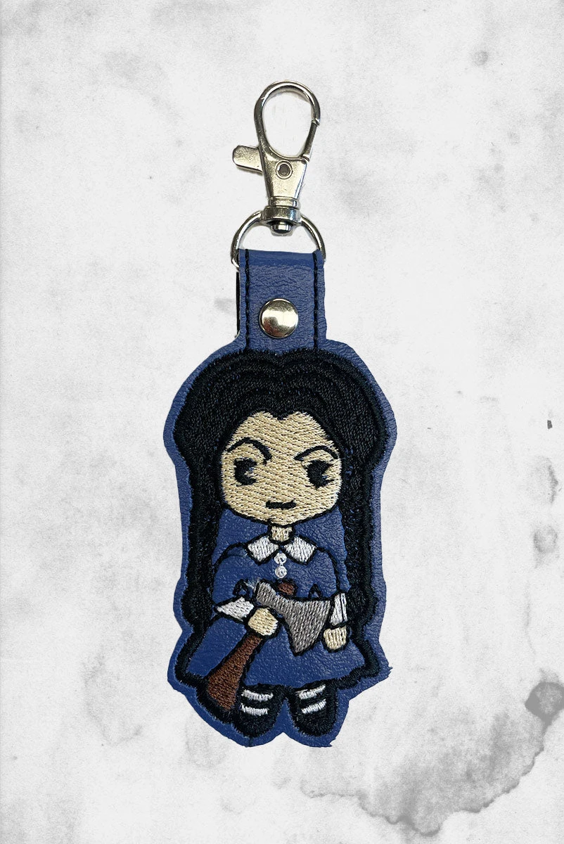 Get ready to be spooky and show everyone your love for The Addams Family, with these embroidered keychains featuring Wednesday Addams! Each keychain is hand done out of the highest quality materials and hand assembled for the strongest horror bag charm you can get.